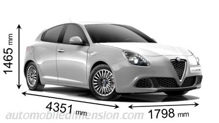 Binnenruimte van 5 zitplaatsen.De Alfa-Romeo Giulietta heeft een lengte van 4351 mm, een hoogte van 1465 mm en een breedte van 1798 mm zonder de buitenspiegels. Vanwege zijn buitenmaat, classificeren wij de Alfa-Romeo Giulietta in de categorie compacte auto's. Dit model van het jaar 2016 is even groot in vergelijking met de afmetingen van de Alfa-Romeo Giulietta 2010. 2016 model te koop als nieuw tot 2021.